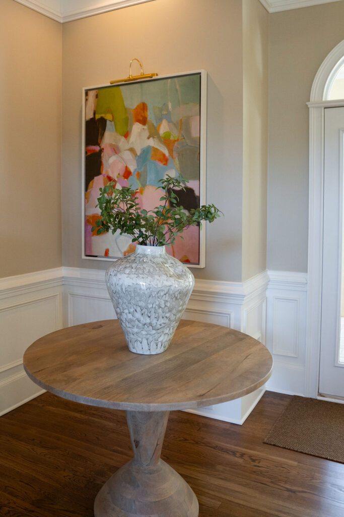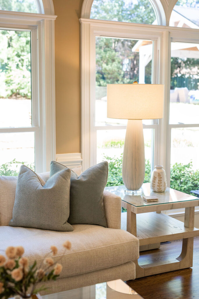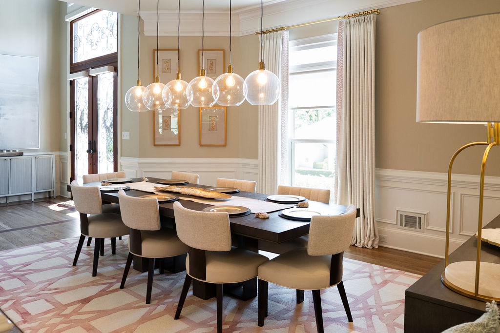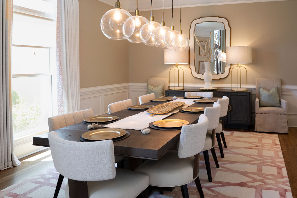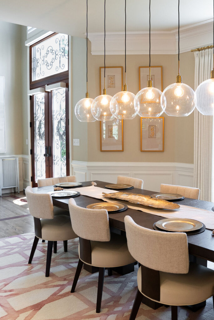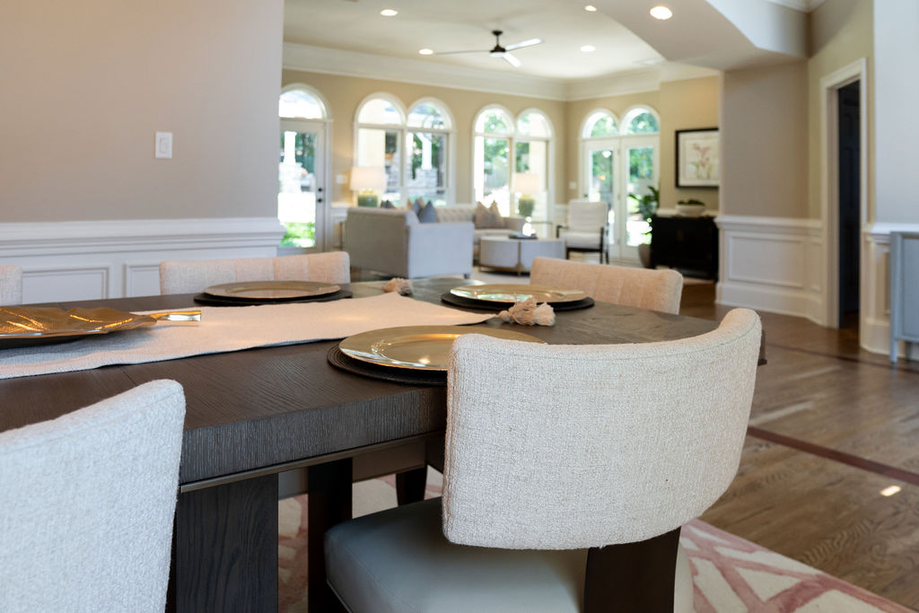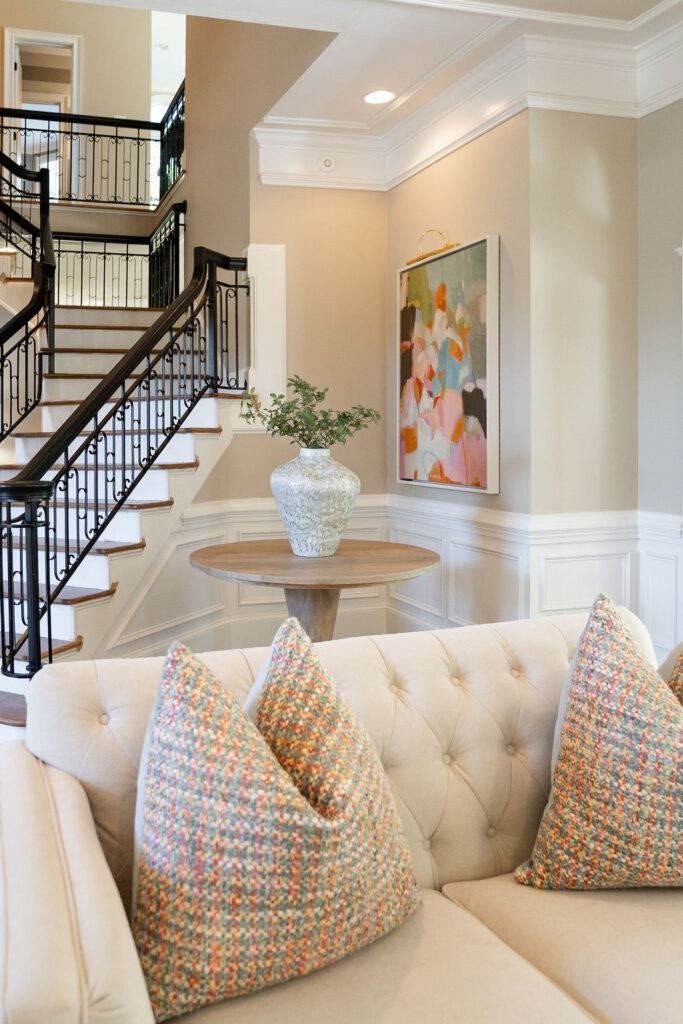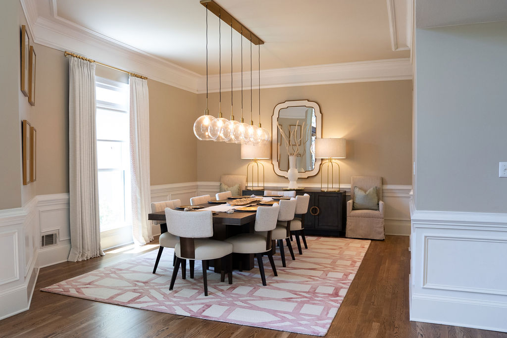 This graceful home pairs refined materials with a soft, livable palette to create spaces that feel both elevated and effortless. From the sculptural chandelier in the dining room to the tailored upholstery and layered rugs throughout, each room reflects a thoughtful balance of sophistication and comfort. Tones of ivory, blush, taupe, and pale gray flow from space to space, accented by textured fabrics, clean-lined furniture, and curated art. The result is a serene and welcoming retreat that’s elegant without being overdone – designed for real life, beautifully lived.