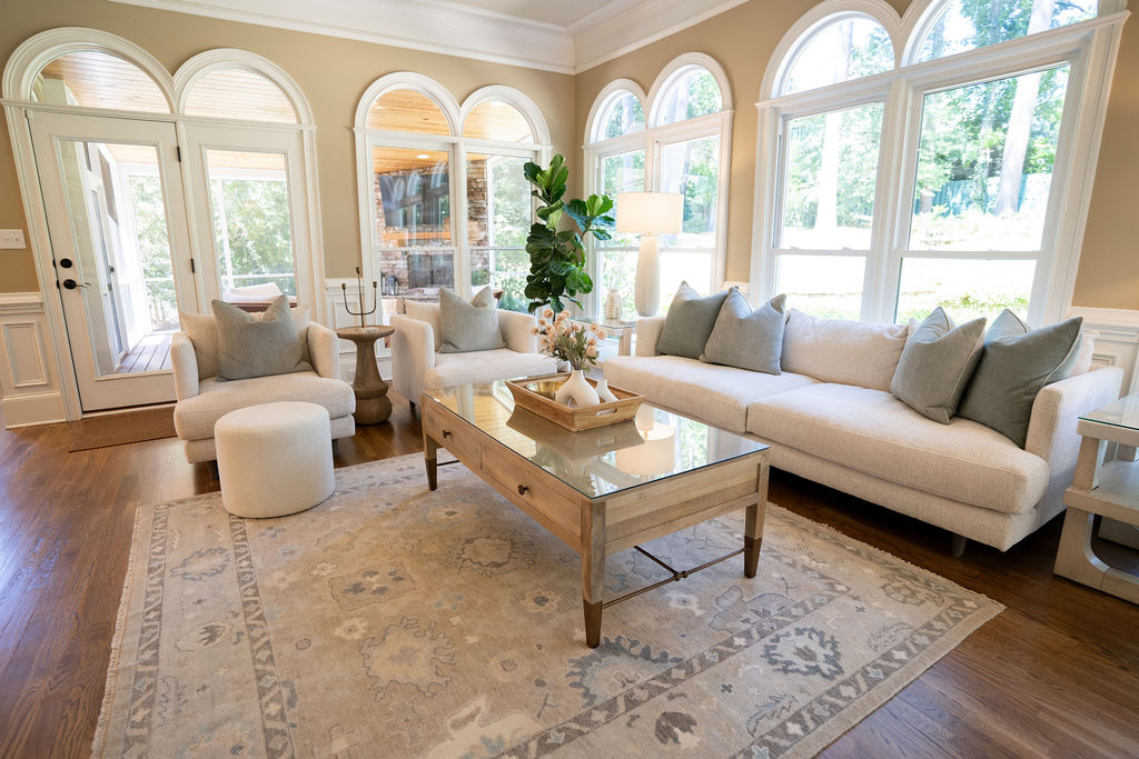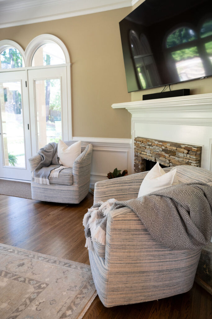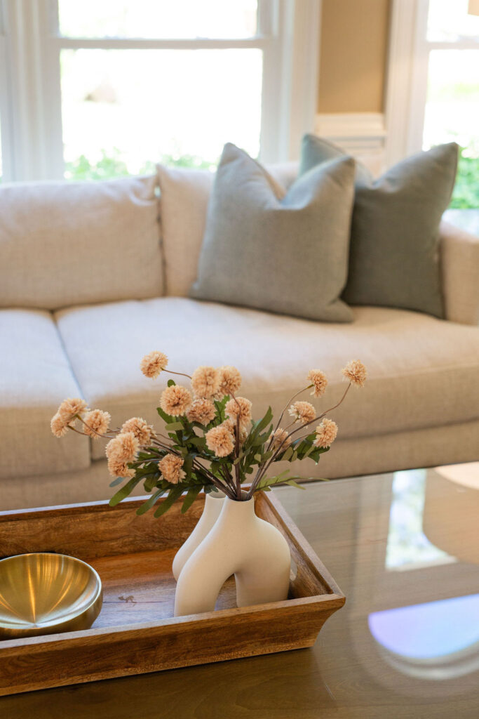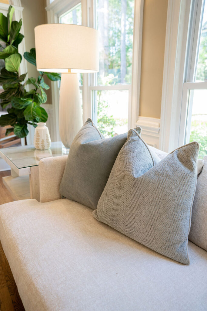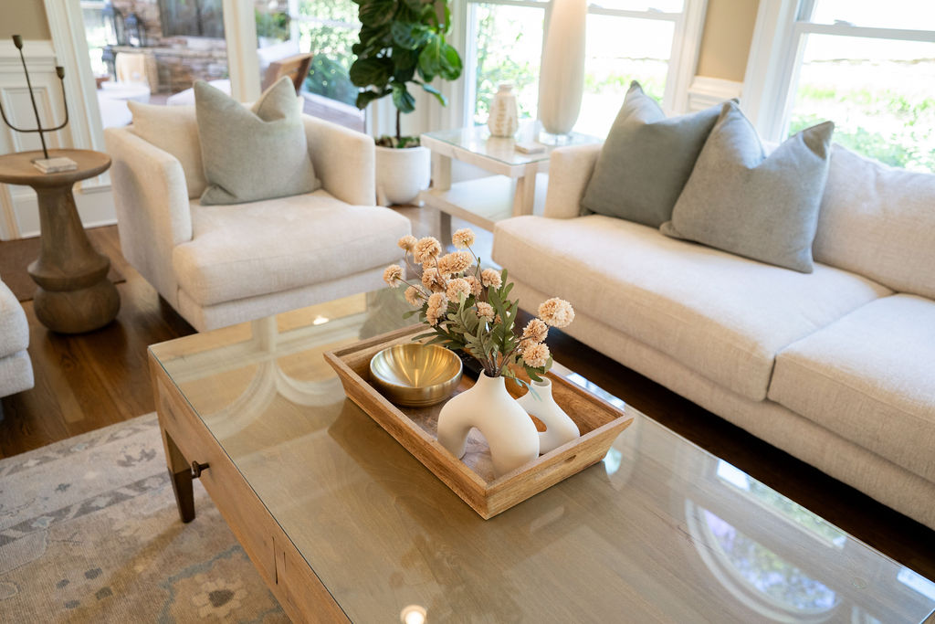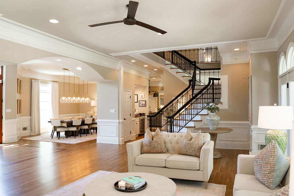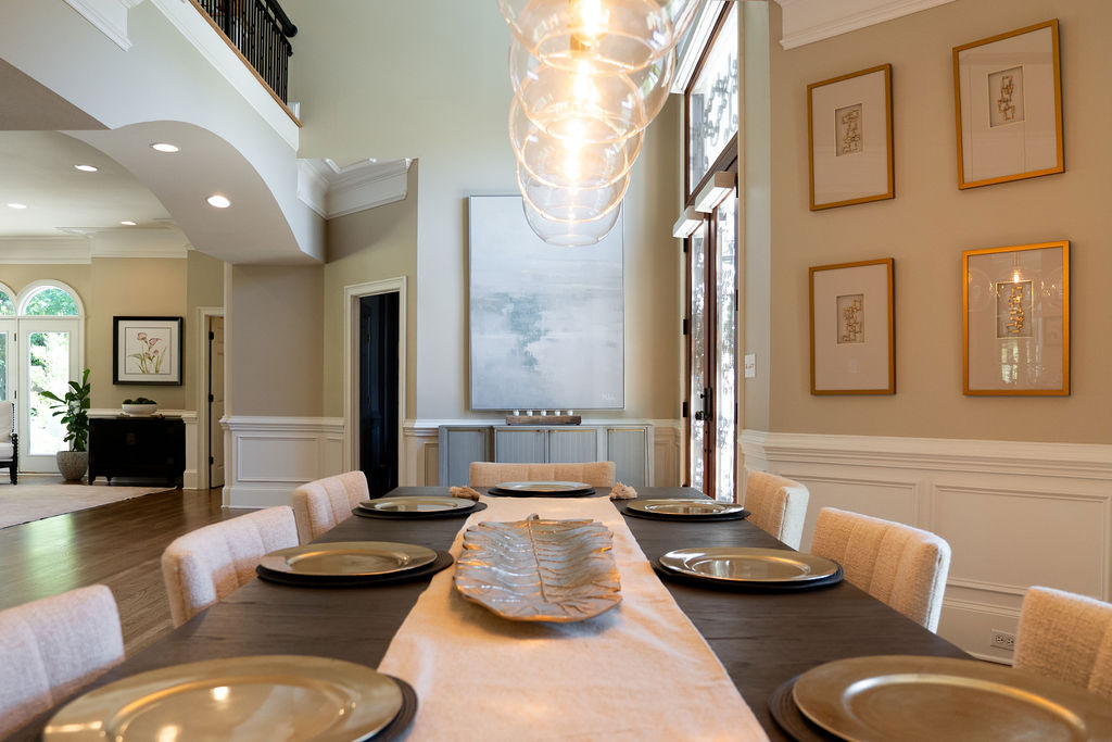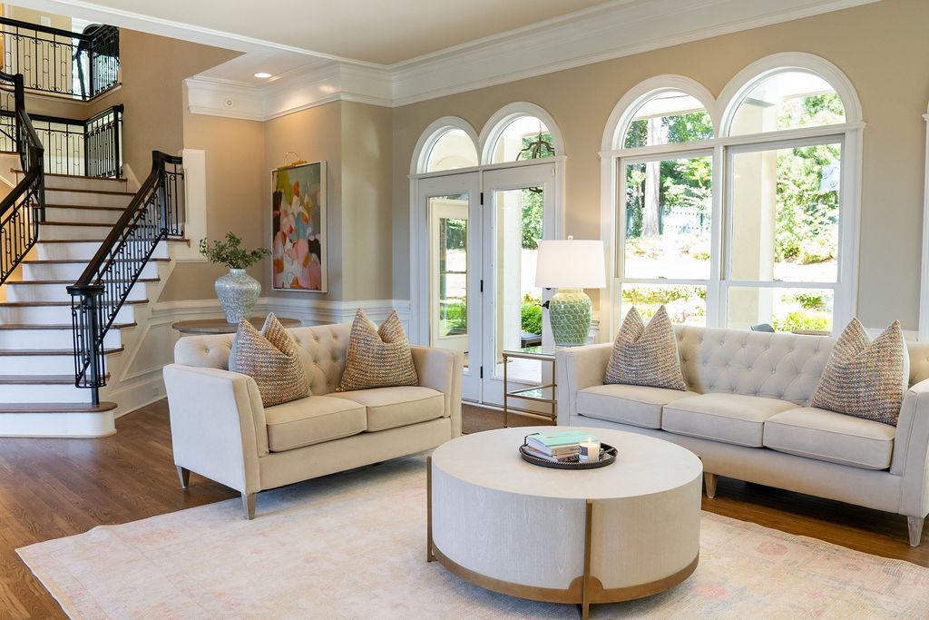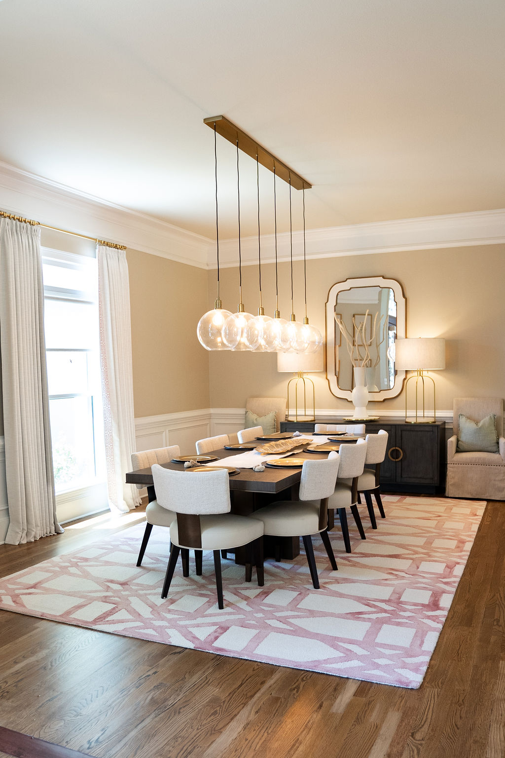 This graceful home pairs refined materials with a soft, livable palette to create spaces that feel both elevated and effortless. From the sculptural chandelier in the dining room to the tailored upholstery and layered rugs throughout, each room reflects a thoughtful balance of sophistication and comfort. Tones of ivory, blush, taupe, and pale gray flow from space to space, accented by textured fabrics, clean-lined furniture, and curated art. The result is a serene and welcoming retreat that’s elegant without being overdone – designed for real life, beautifully lived.