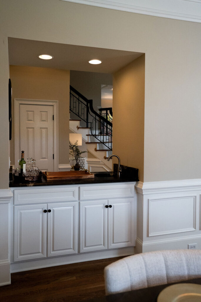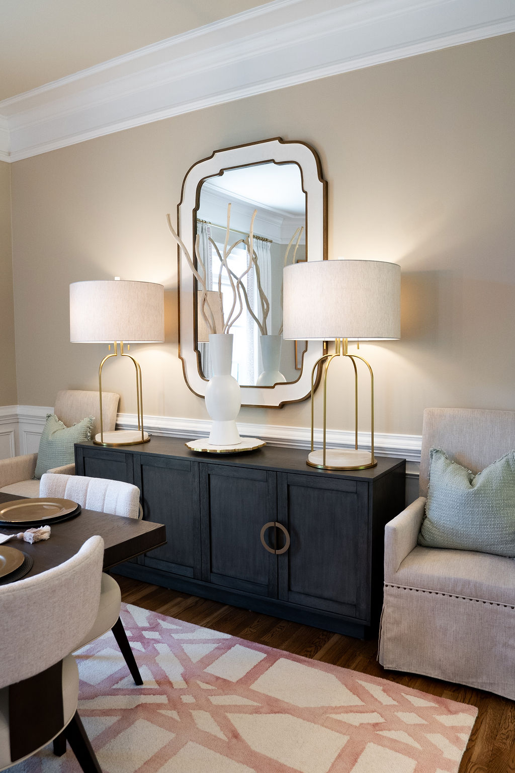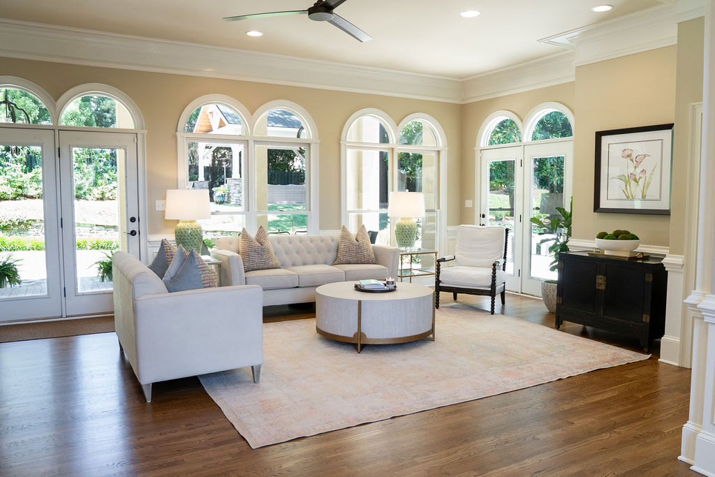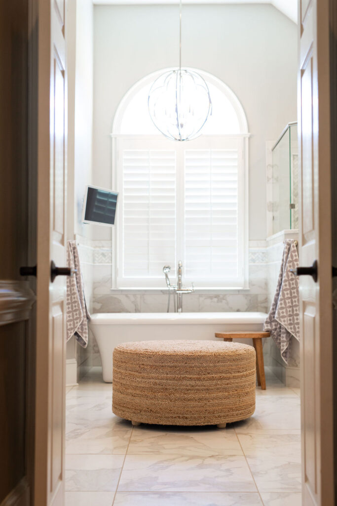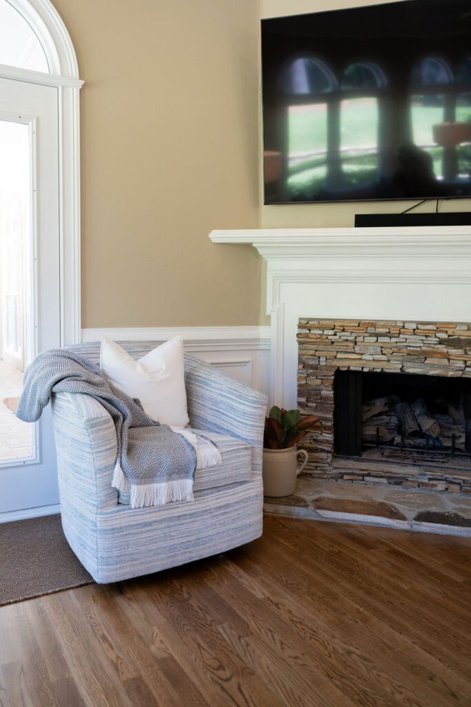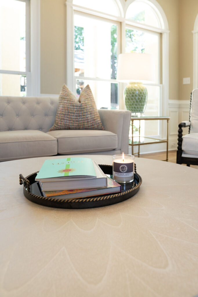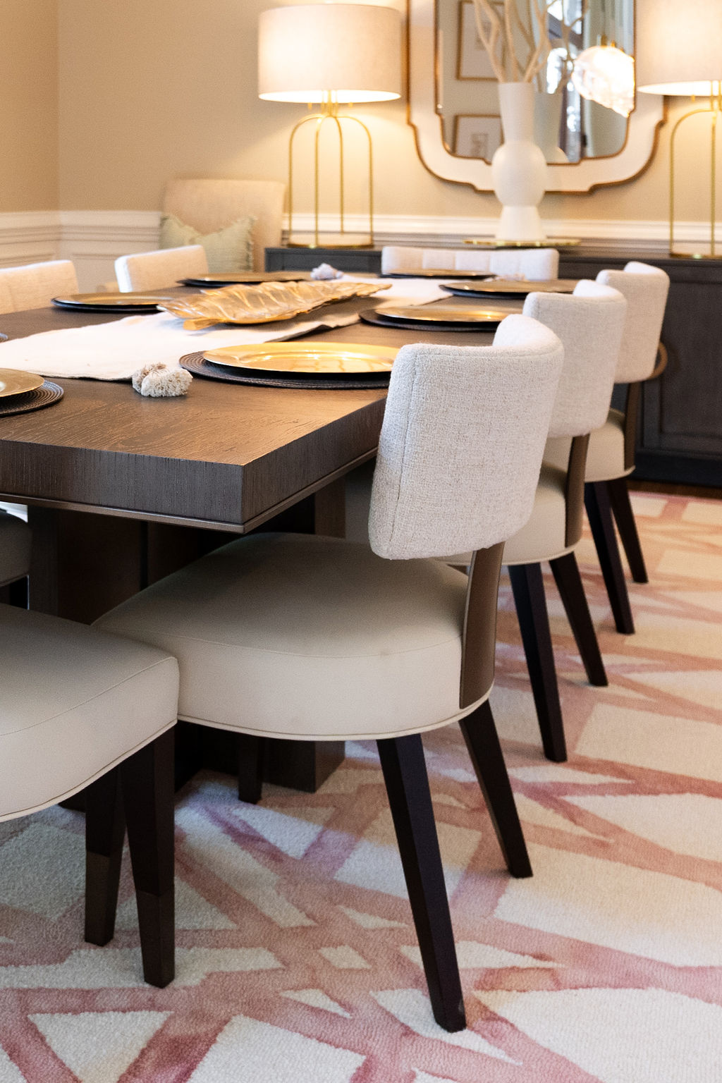 This graceful home pairs refined materials with a soft, livable palette to create spaces that feel both elevated and effortless. From the sculptural chandelier in the dining room to the tailored upholstery and layered rugs throughout, each room reflects a thoughtful balance of sophistication and comfort. Tones of ivory, blush, taupe, and pale gray flow from space to space, accented by textured fabrics, clean-lined furniture, and curated art. The result is a serene and welcoming retreat that’s elegant without being overdone – designed for real life, beautifully lived.