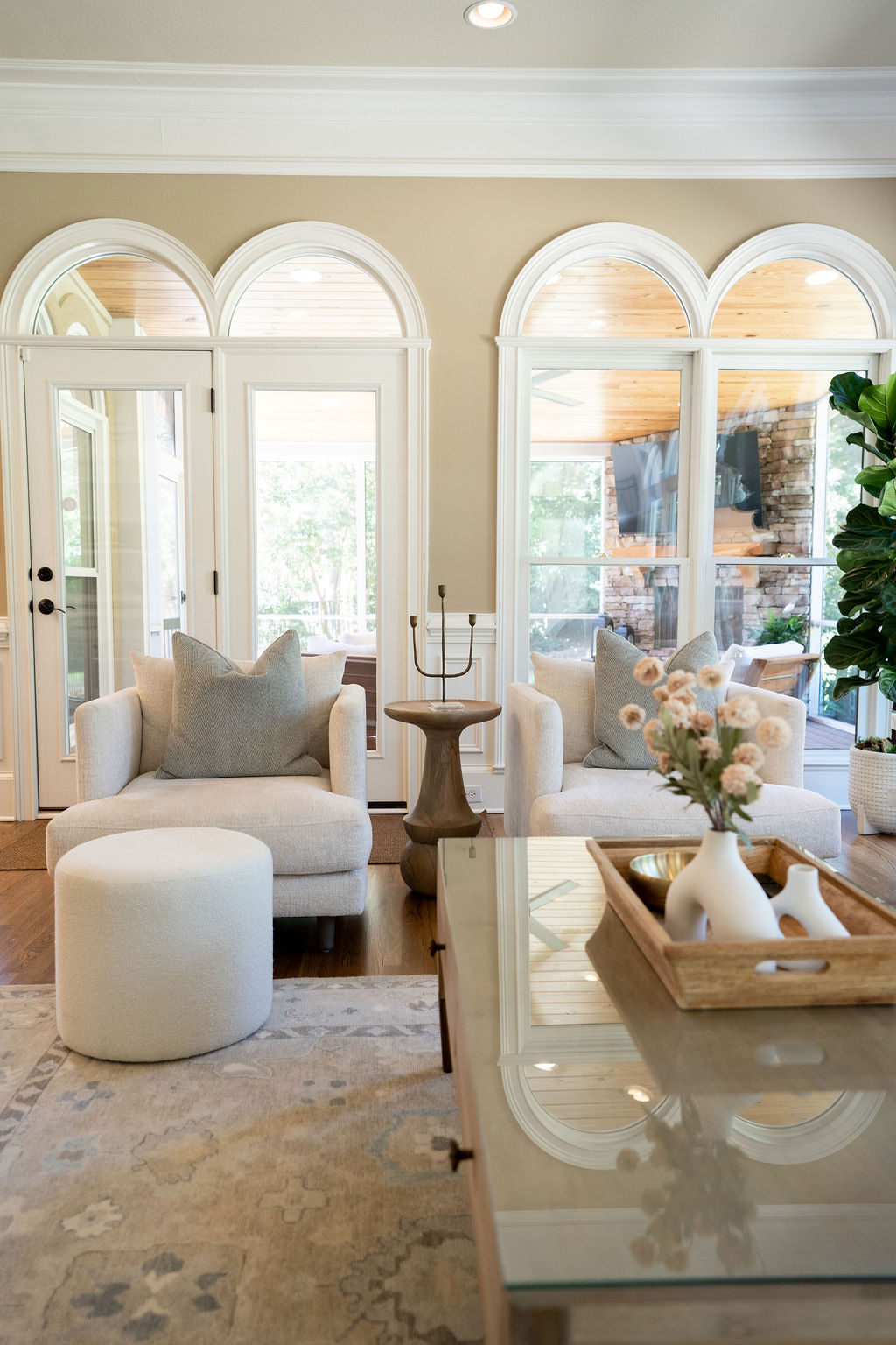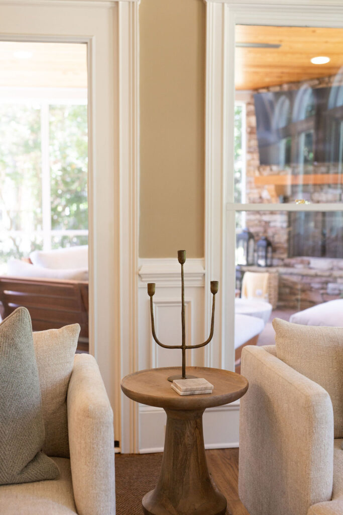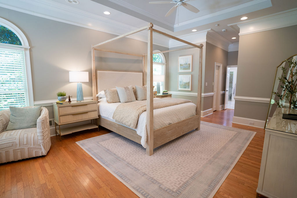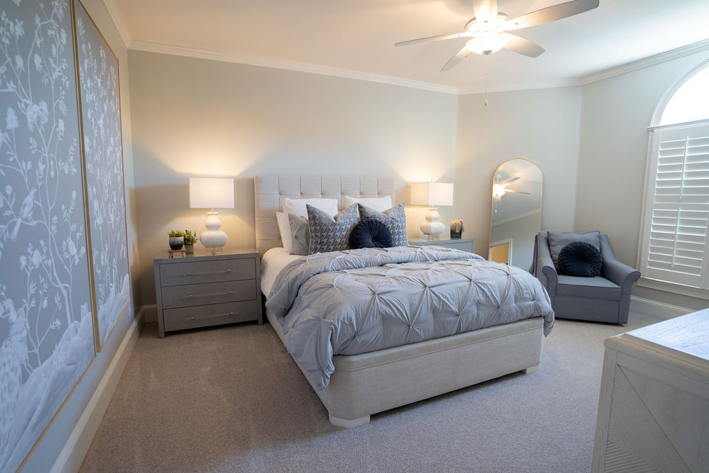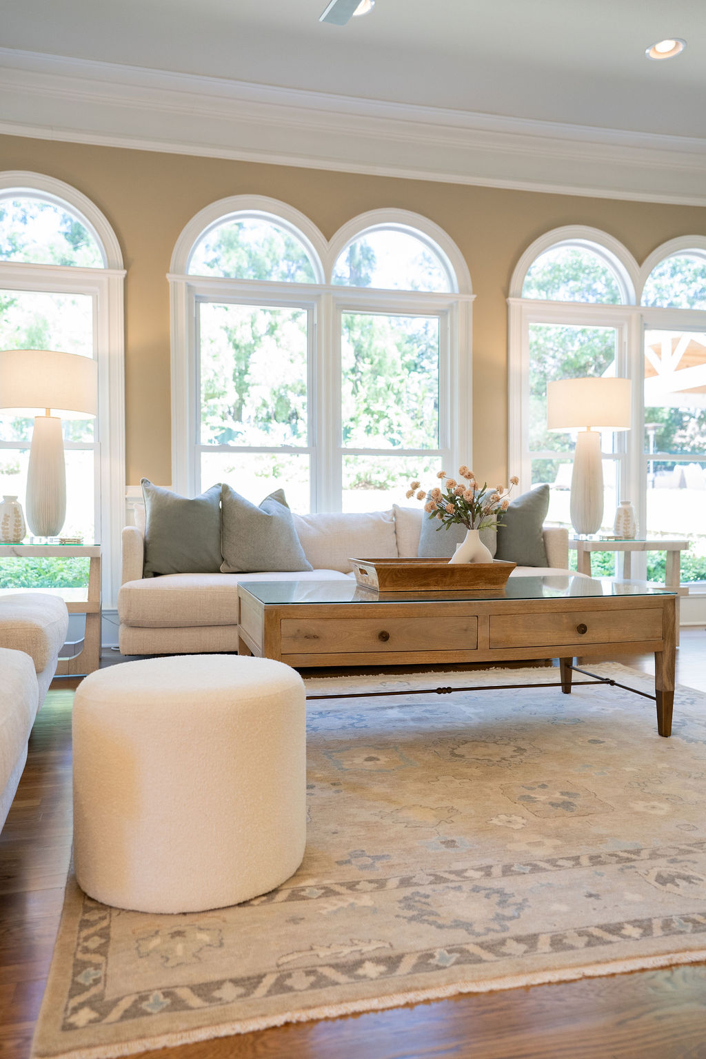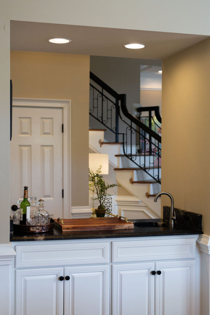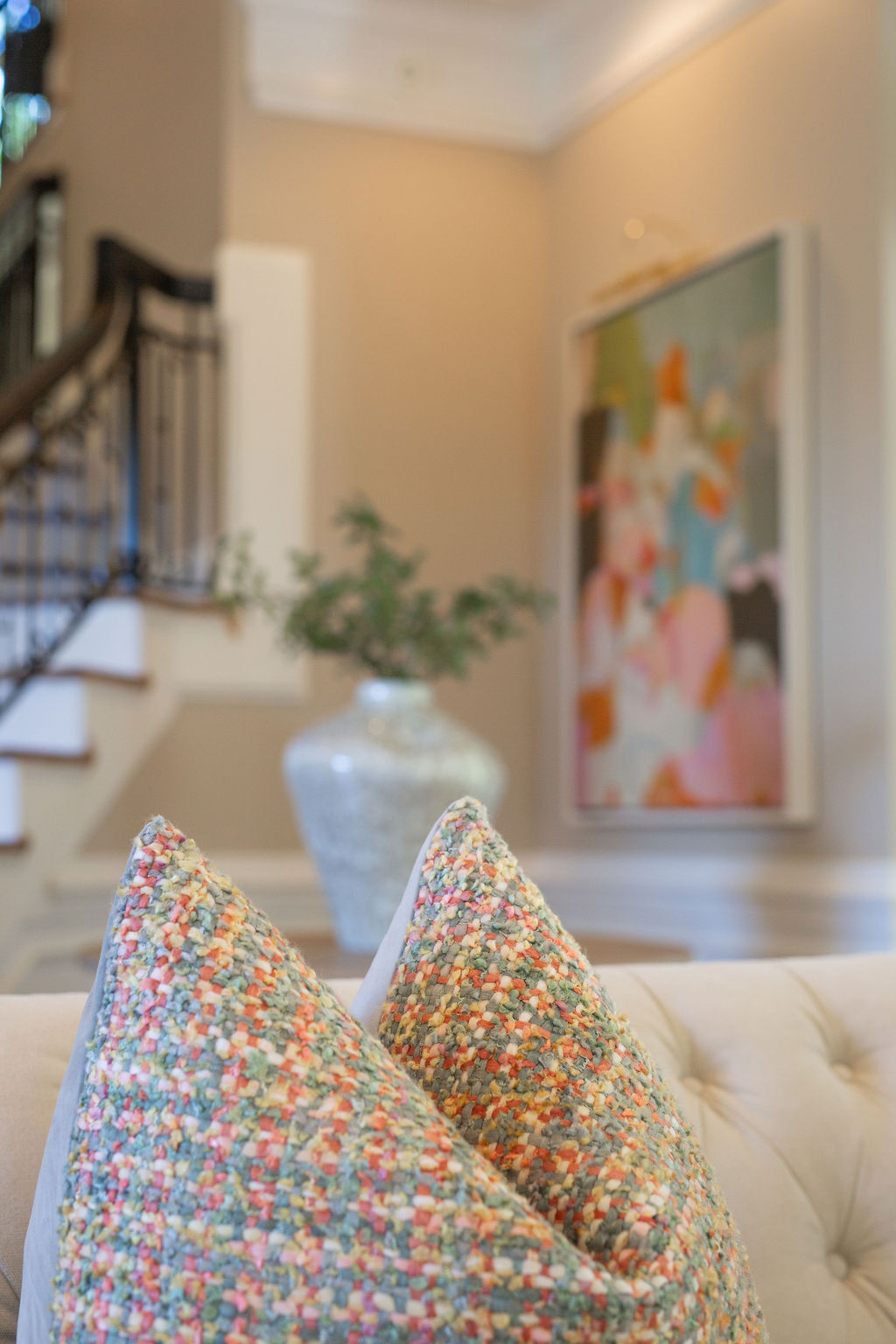 This graceful home pairs refined materials with a soft, livable palette to create spaces that feel both elevated and effortless. From the sculptural chandelier in the dining room to the tailored upholstery and layered rugs throughout, each room reflects a thoughtful balance of sophistication and comfort. Tones of ivory, blush, taupe, and pale gray flow from space to space, accented by textured fabrics, clean-lined furniture, and curated art. The result is a serene and welcoming retreat that’s elegant without being overdone – designed for real life, beautifully lived.