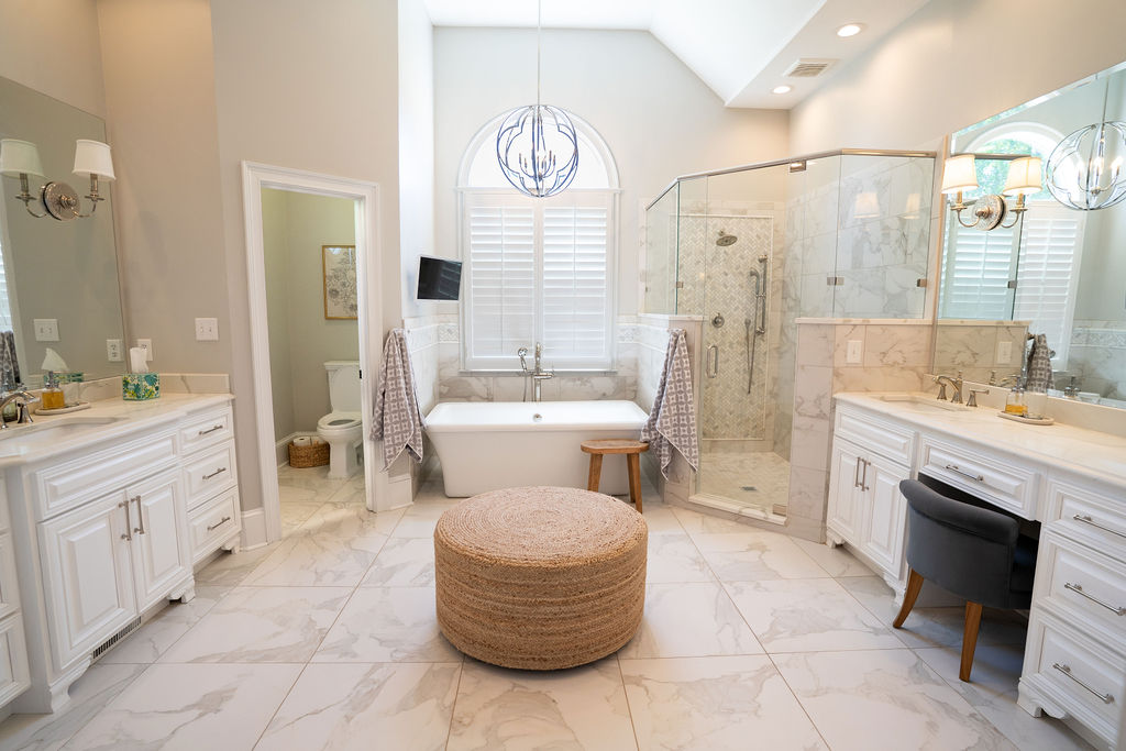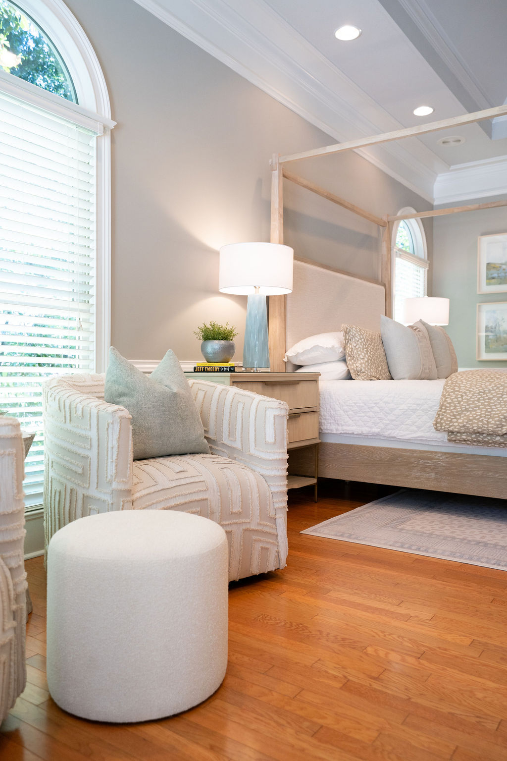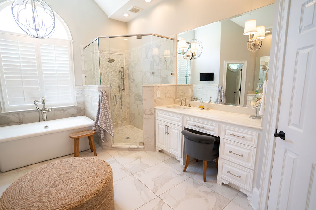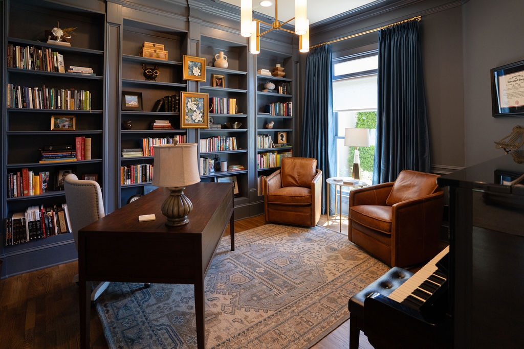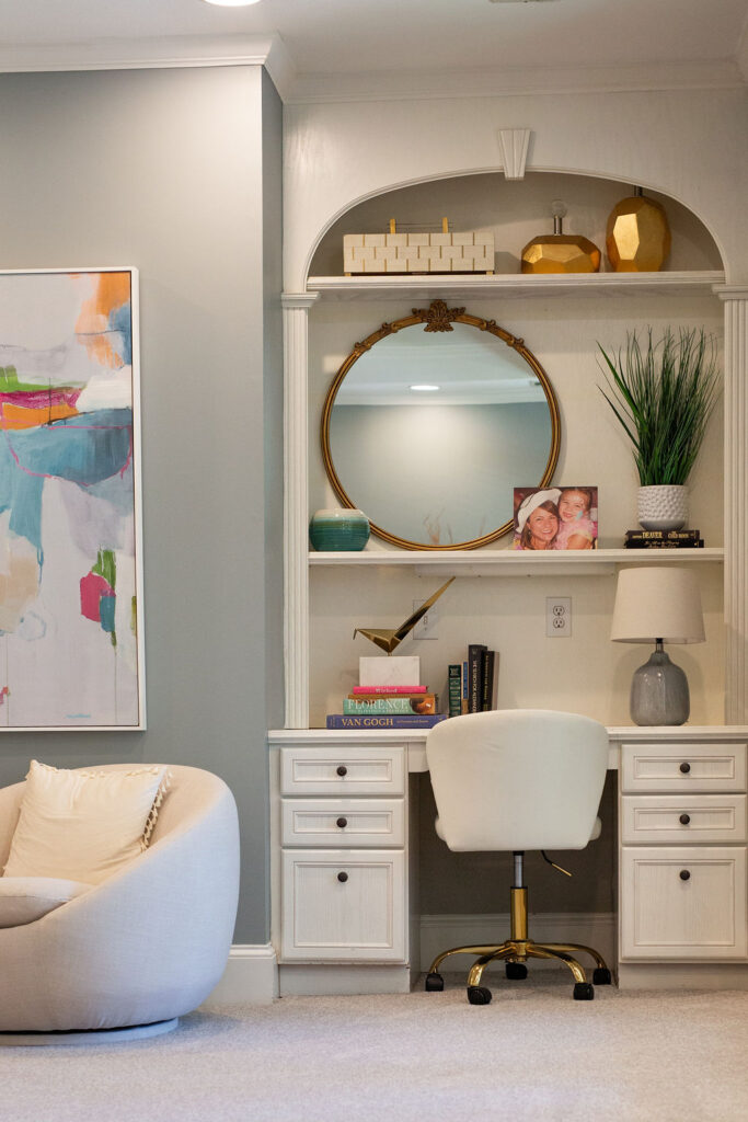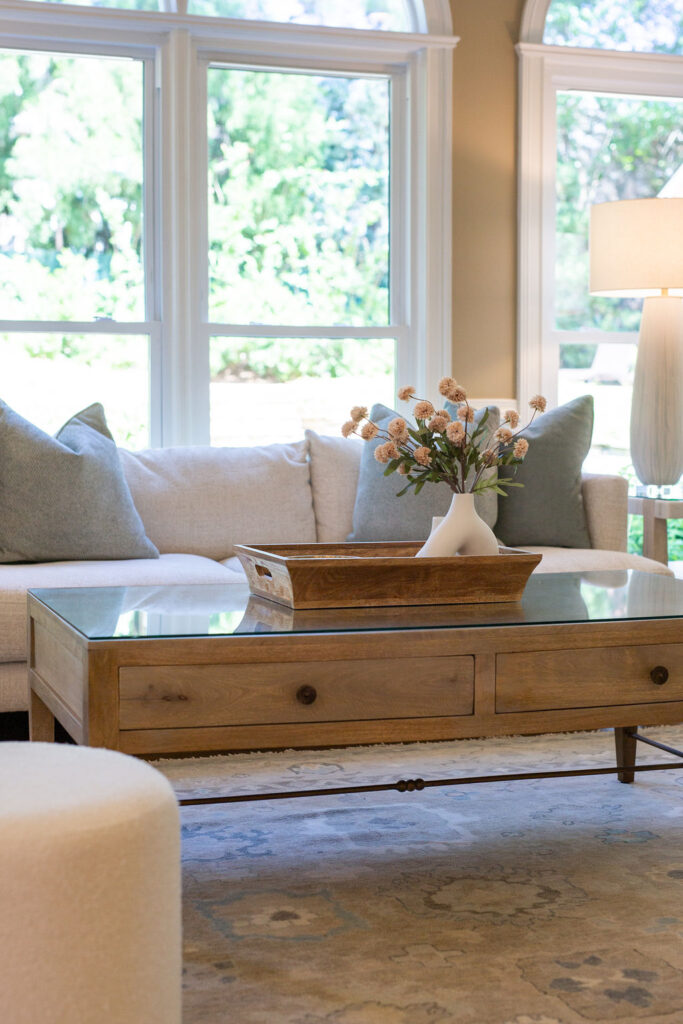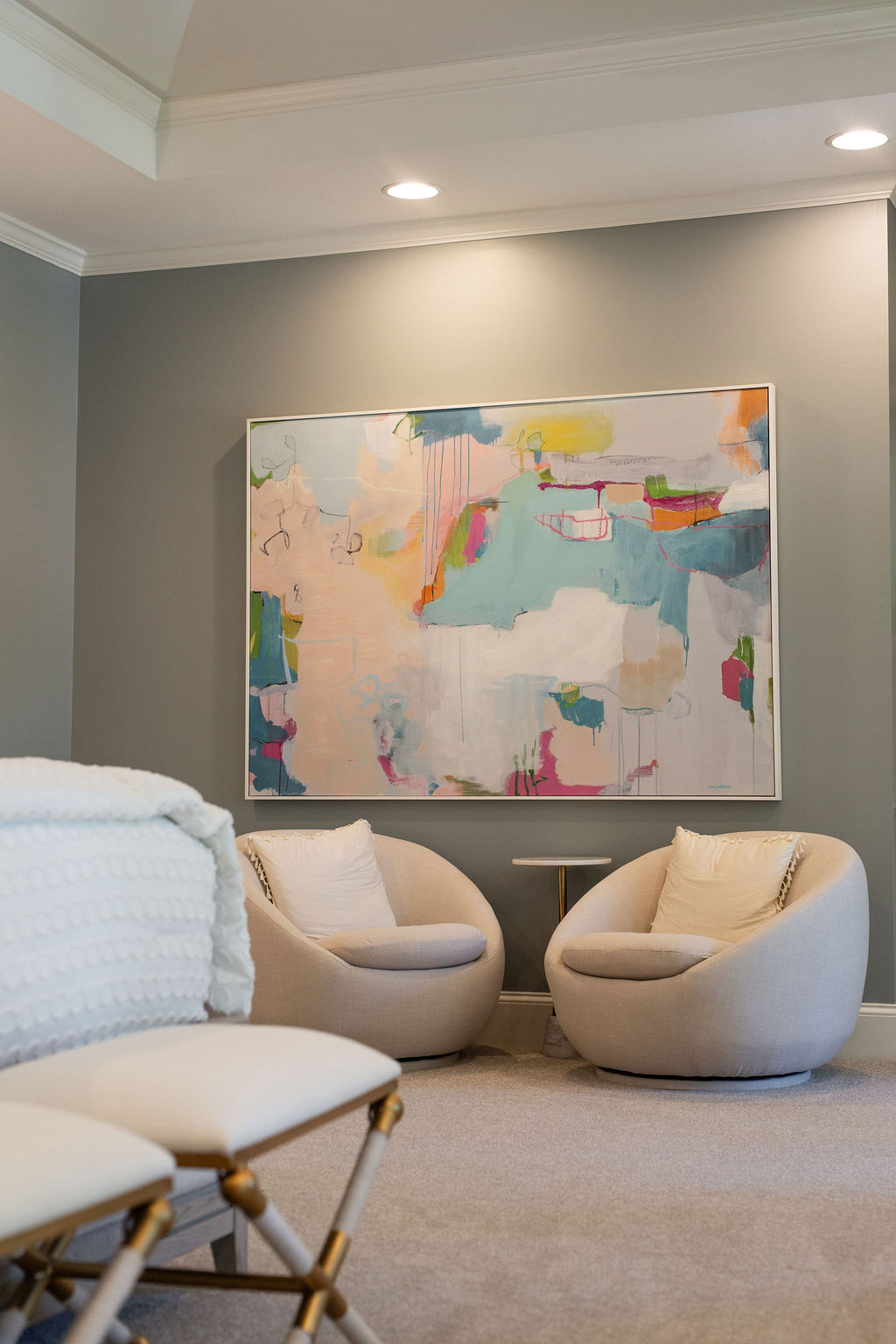 This graceful home pairs refined materials with a soft, livable palette to create spaces that feel both elevated and effortless. From the sculptural chandelier in the dining room to the tailored upholstery and layered rugs throughout, each room reflects a thoughtful balance of sophistication and comfort. Tones of ivory, blush, taupe, and pale gray flow from space to space, accented by textured fabrics, clean-lined furniture, and curated art. The result is a serene and welcoming retreat that’s elegant without being overdone – designed for real life, beautifully lived.