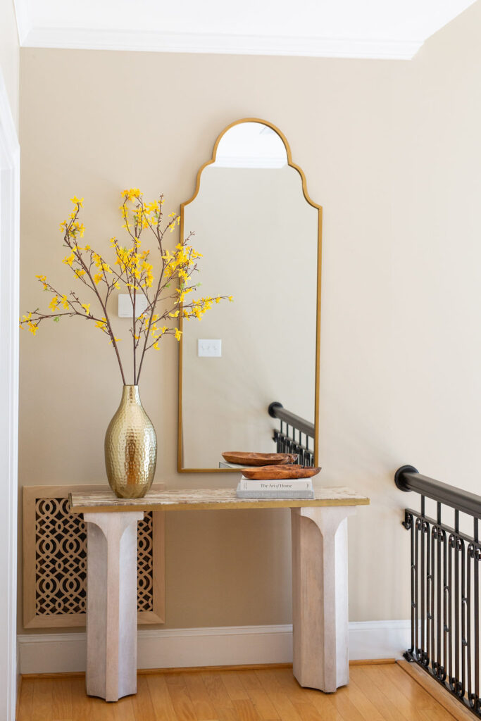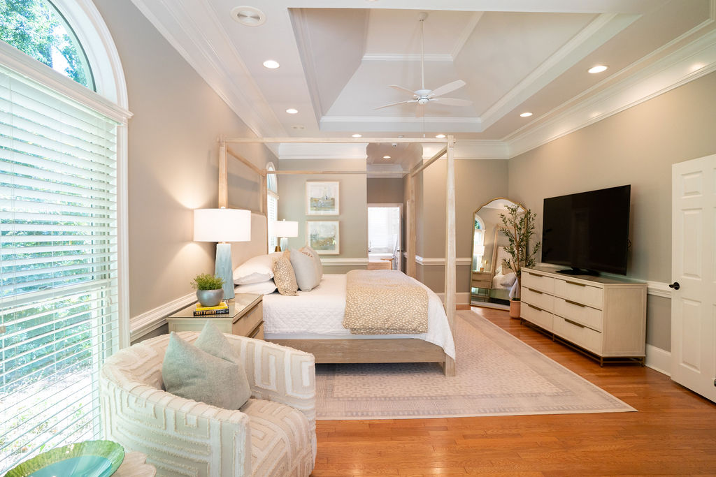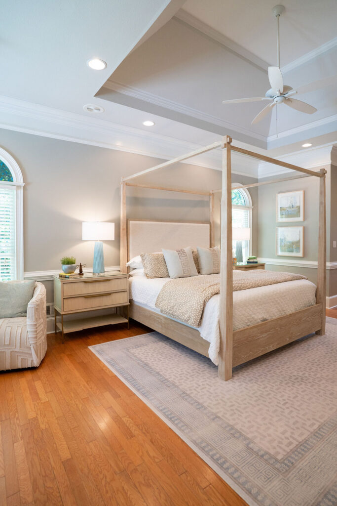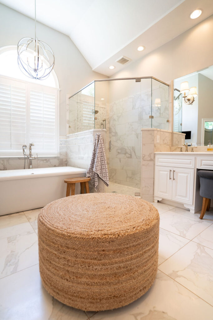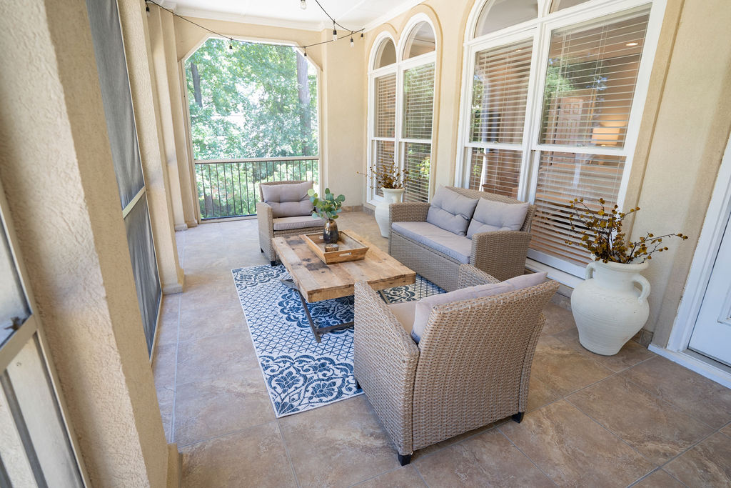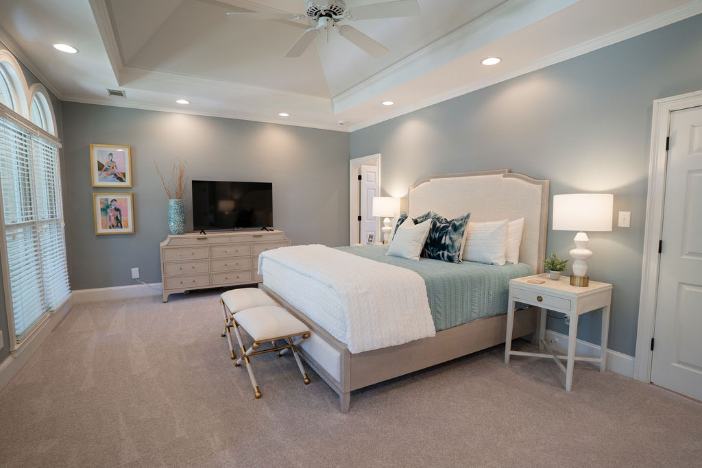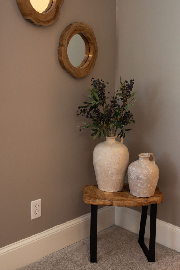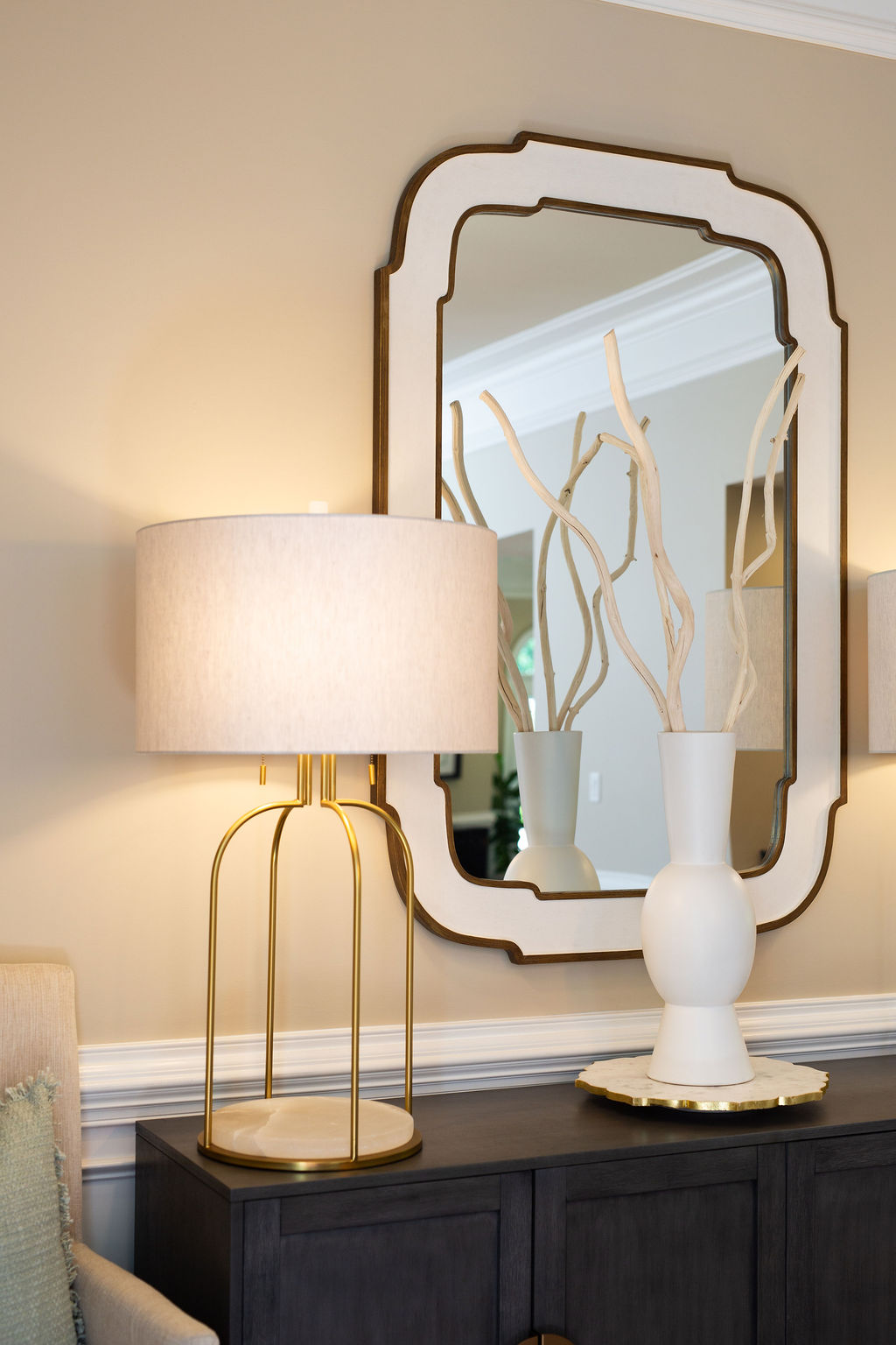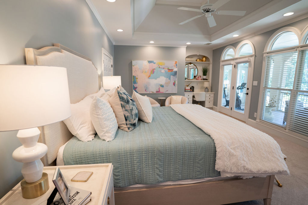 This graceful home pairs refined materials with a soft, livable palette to create spaces that feel both elevated and effortless. From the sculptural chandelier in the dining room to the tailored upholstery and layered rugs throughout, each room reflects a thoughtful balance of sophistication and comfort. Tones of ivory, blush, taupe, and pale gray flow from space to space, accented by textured fabrics, clean-lined furniture, and curated art. The result is a serene and welcoming retreat that’s elegant without being overdone – designed for real life, beautifully lived.