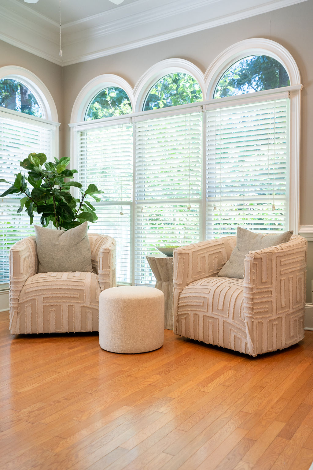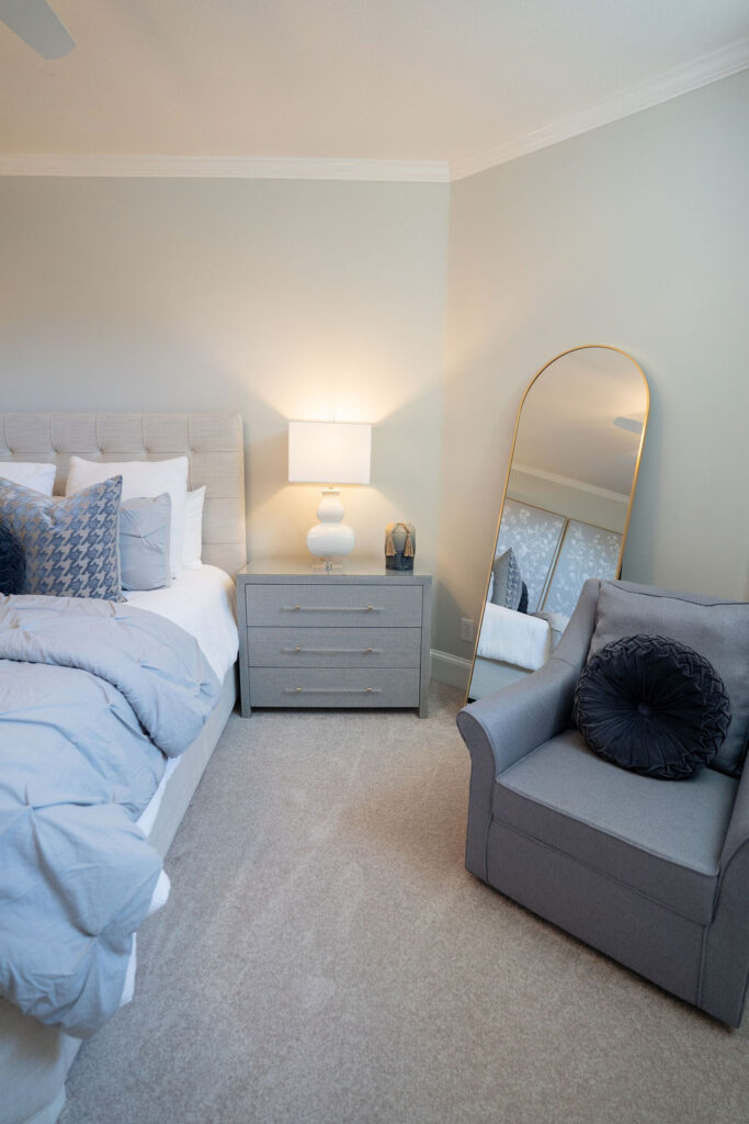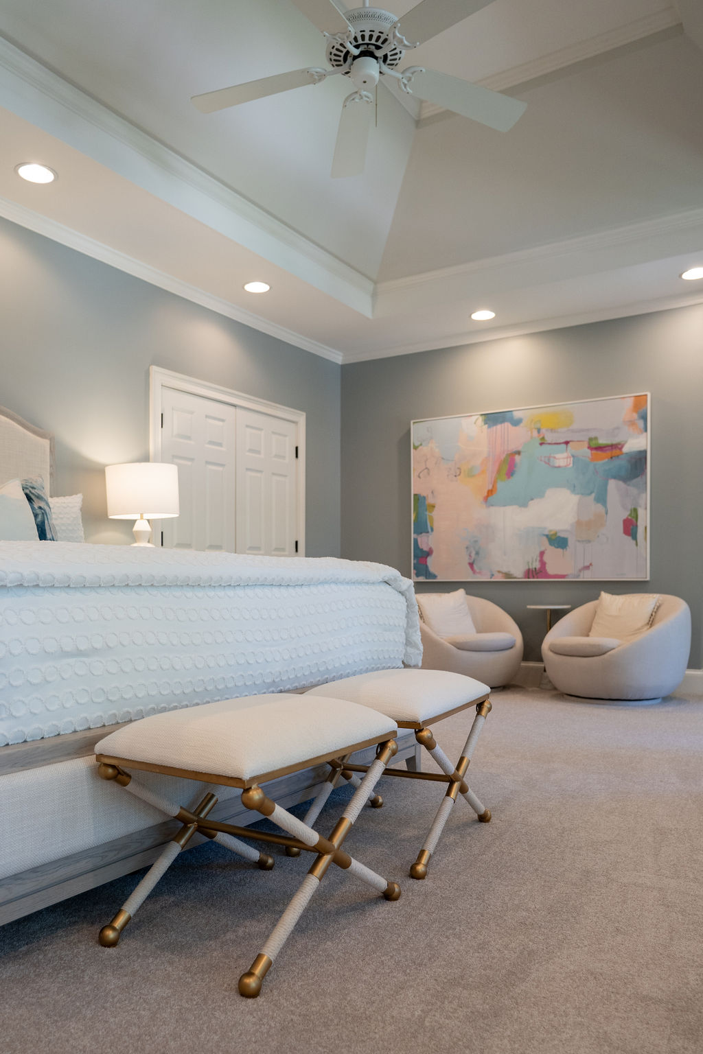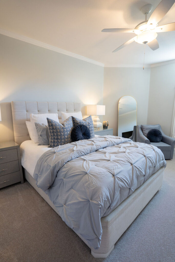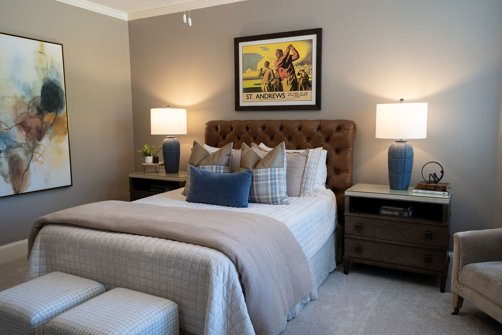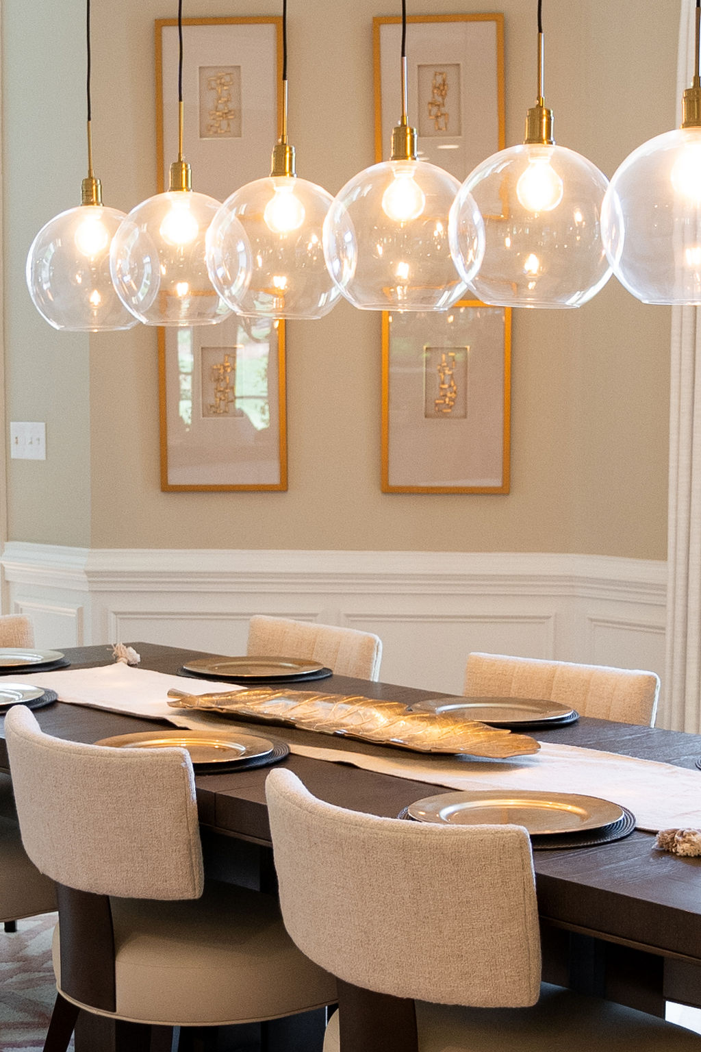 This graceful home pairs refined materials with a soft, livable palette to create spaces that feel both elevated and effortless. From the sculptural chandelier in the dining room to the tailored upholstery and layered rugs throughout, each room reflects a thoughtful balance of sophistication and comfort. Tones of ivory, blush, taupe, and pale gray flow from space to space, accented by textured fabrics, clean-lined furniture, and curated art. The result is a serene and welcoming retreat that’s elegant without being overdone – designed for real life, beautifully lived.