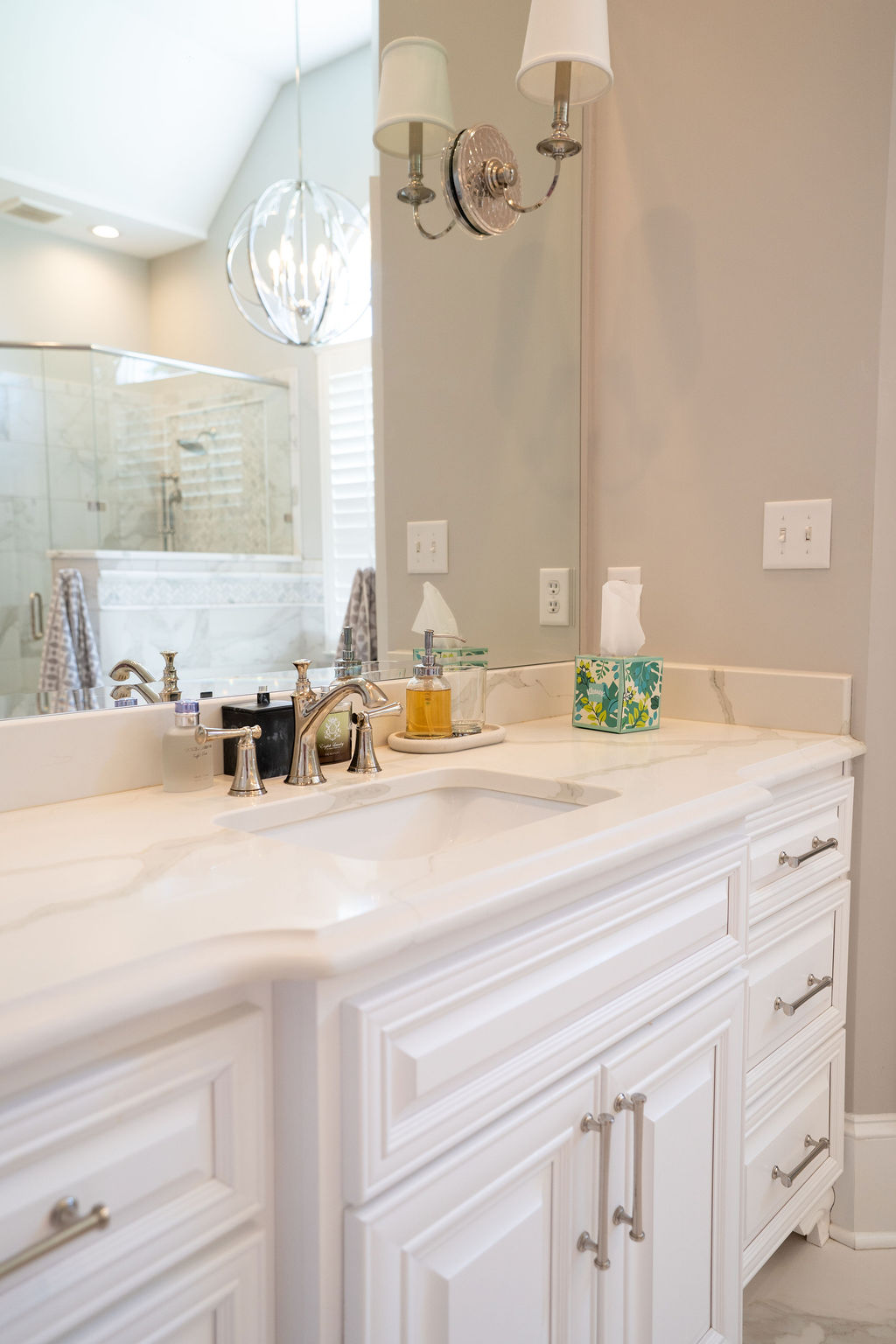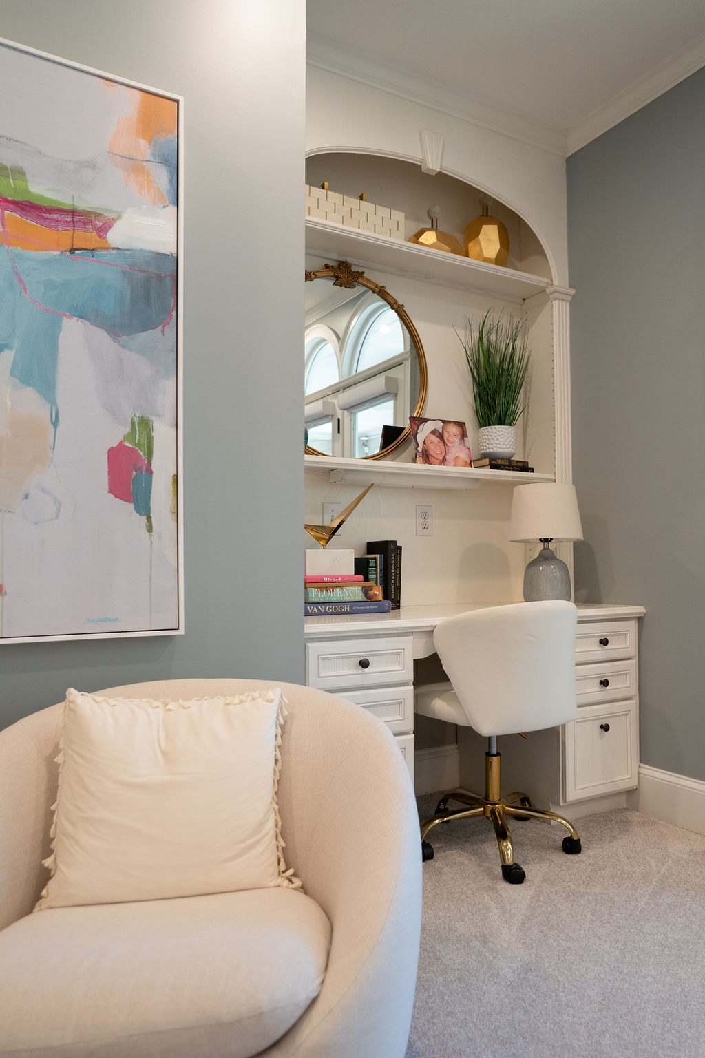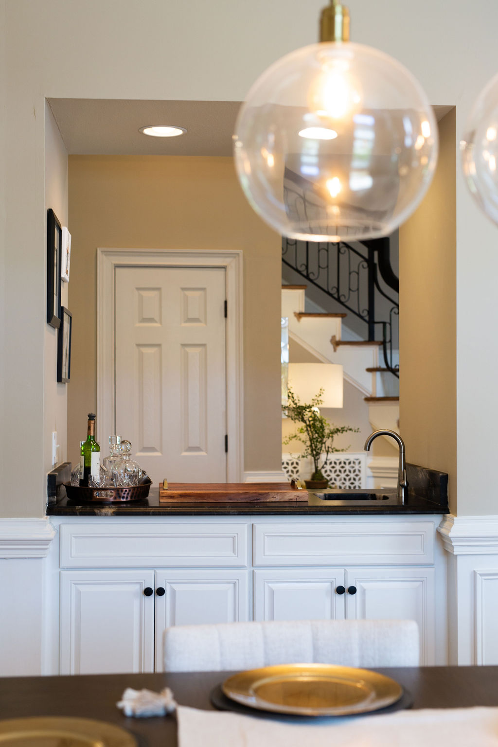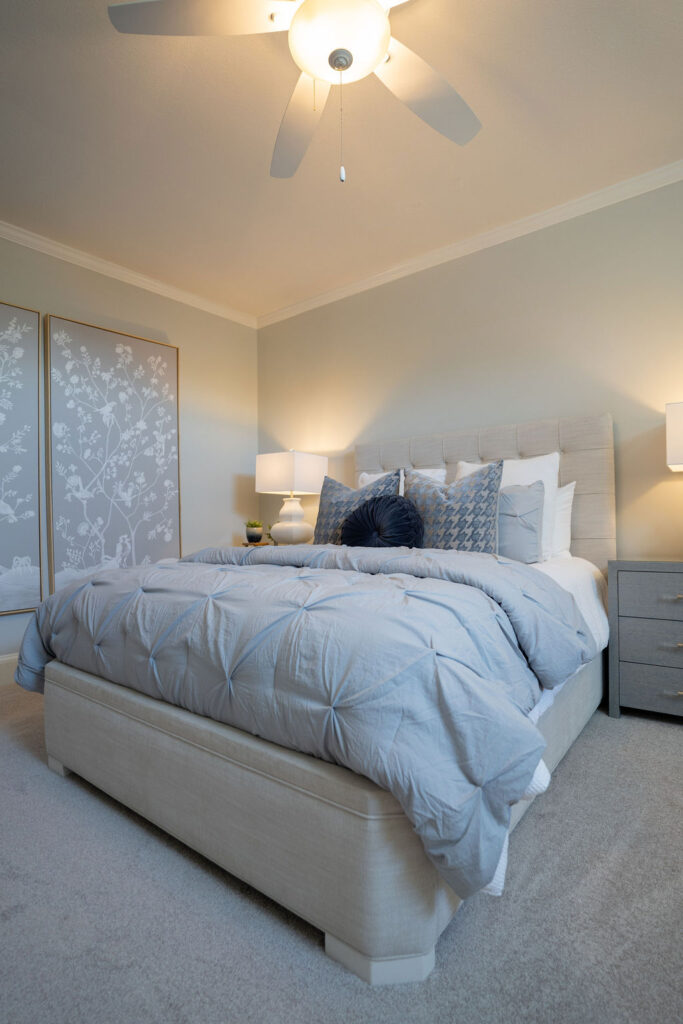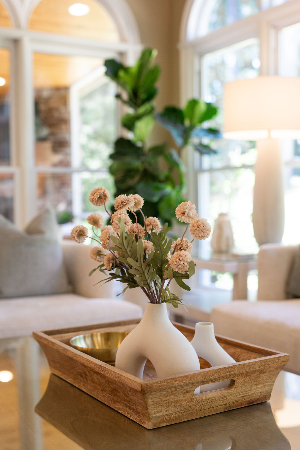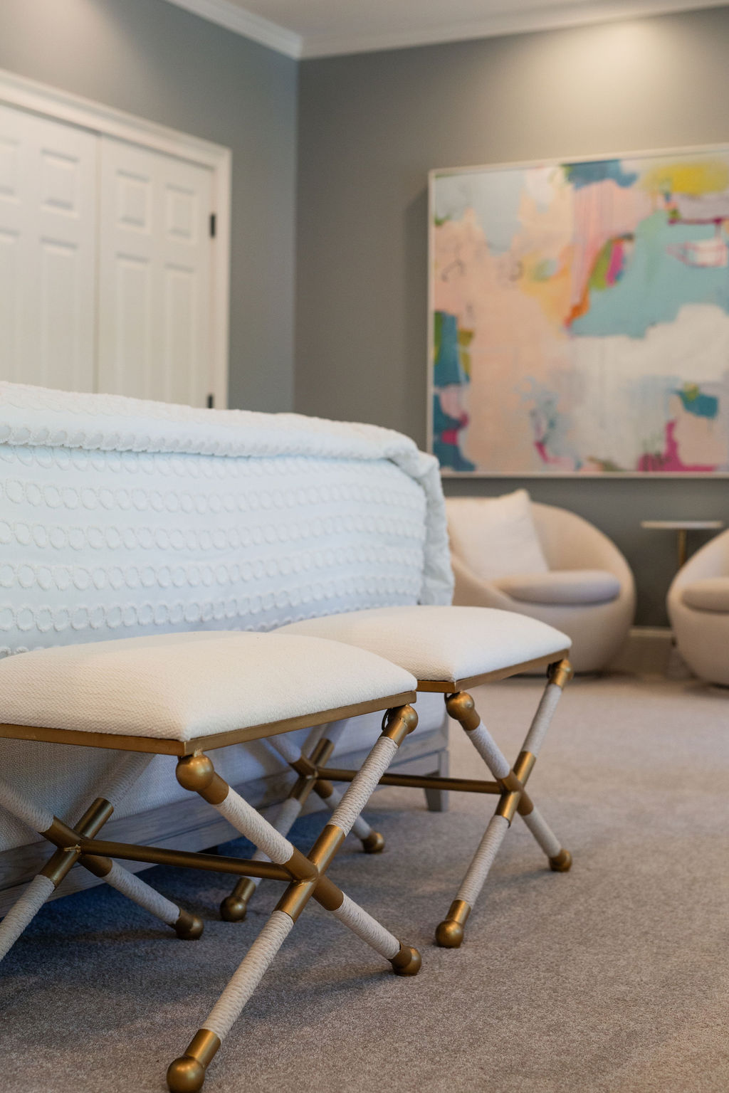 This graceful home pairs refined materials with a soft, livable palette to create spaces that feel both elevated and effortless. From the sculptural chandelier in the dining room to the tailored upholstery and layered rugs throughout, each room reflects a thoughtful balance of sophistication and comfort. Tones of ivory, blush, taupe, and pale gray flow from space to space, accented by textured fabrics, clean-lined furniture, and curated art. The result is a serene and welcoming retreat that’s elegant without being overdone – designed for real life, beautifully lived.
