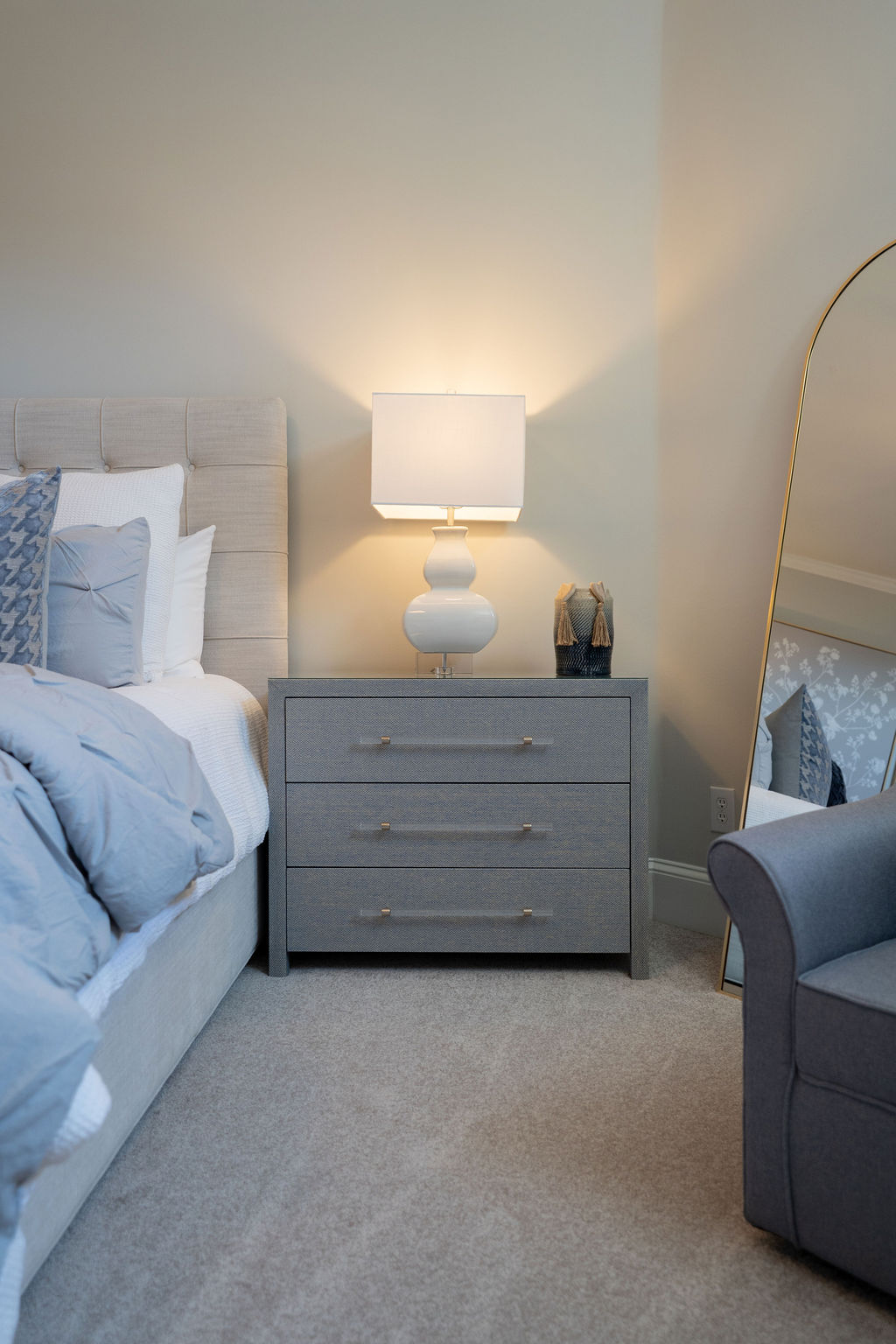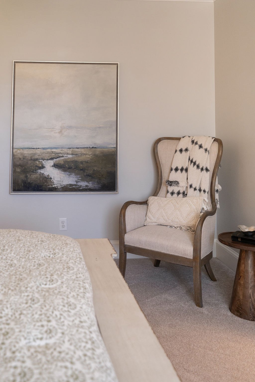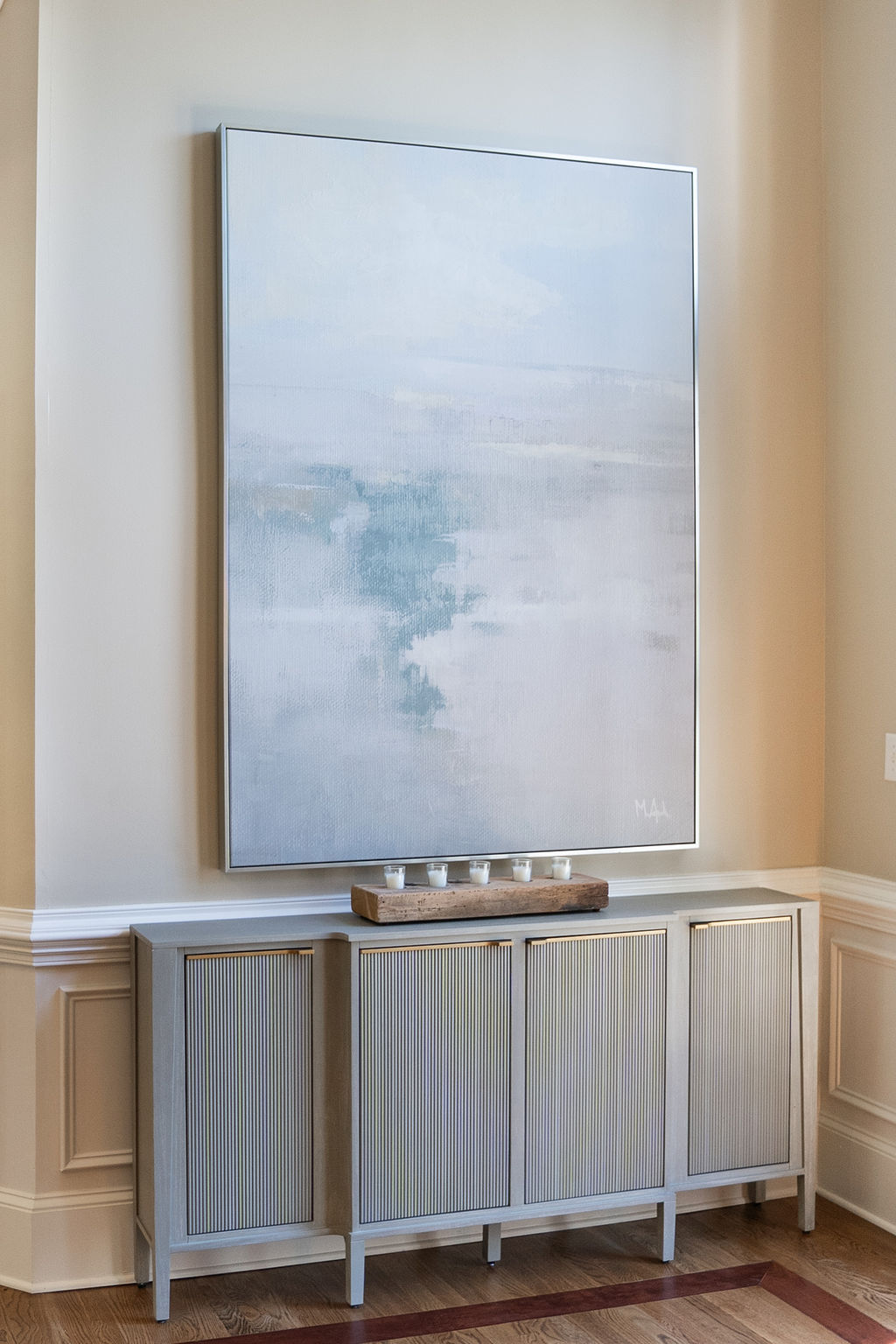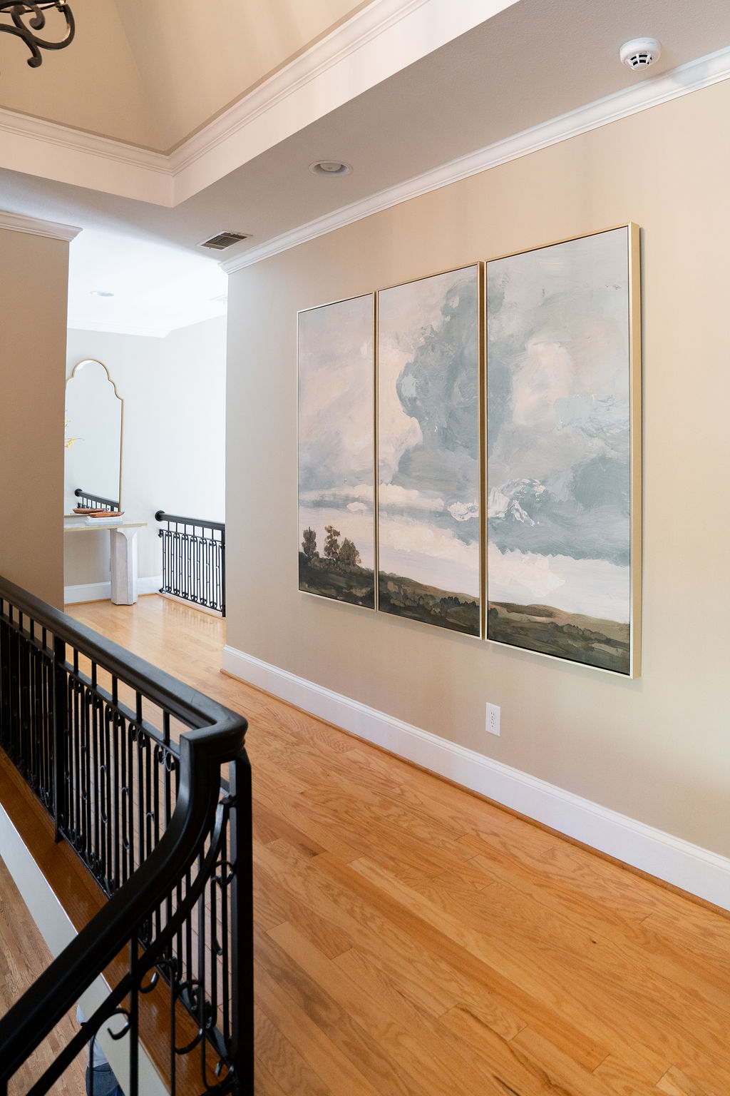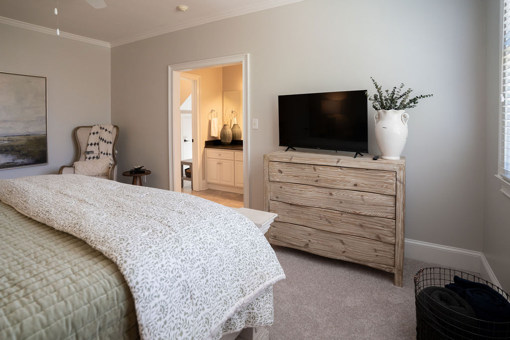 This graceful home pairs refined materials with a soft, livable palette to create spaces that feel both elevated and effortless. From the sculptural chandelier in the dining room to the tailored upholstery and layered rugs throughout, each room reflects a thoughtful balance of sophistication and comfort. Tones of ivory, blush, taupe, and pale gray flow from space to space, accented by textured fabrics, clean-lined furniture, and curated art. The result is a serene and welcoming retreat that’s elegant without being overdone – designed for real life, beautifully lived.