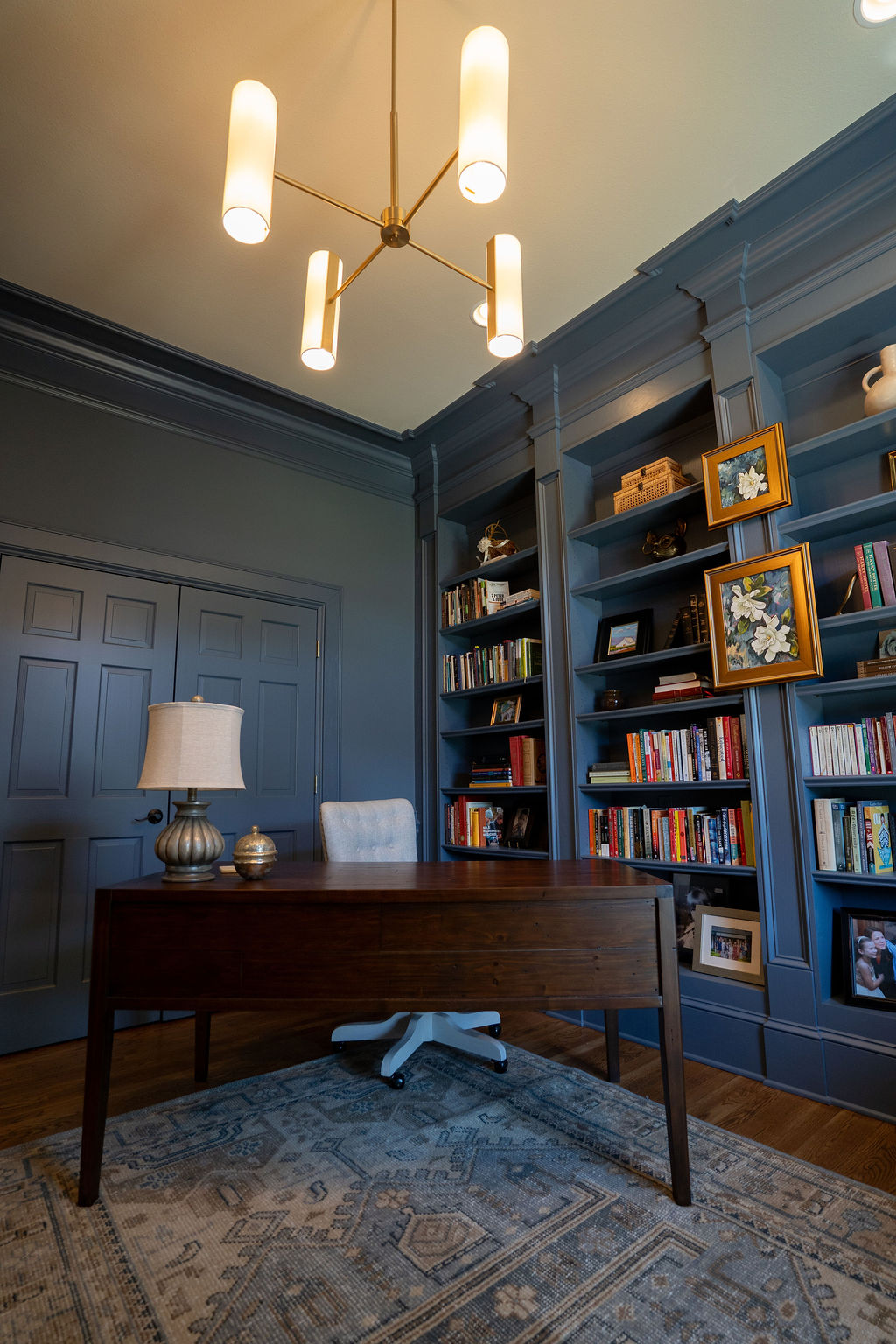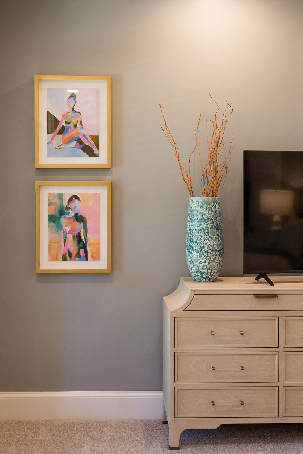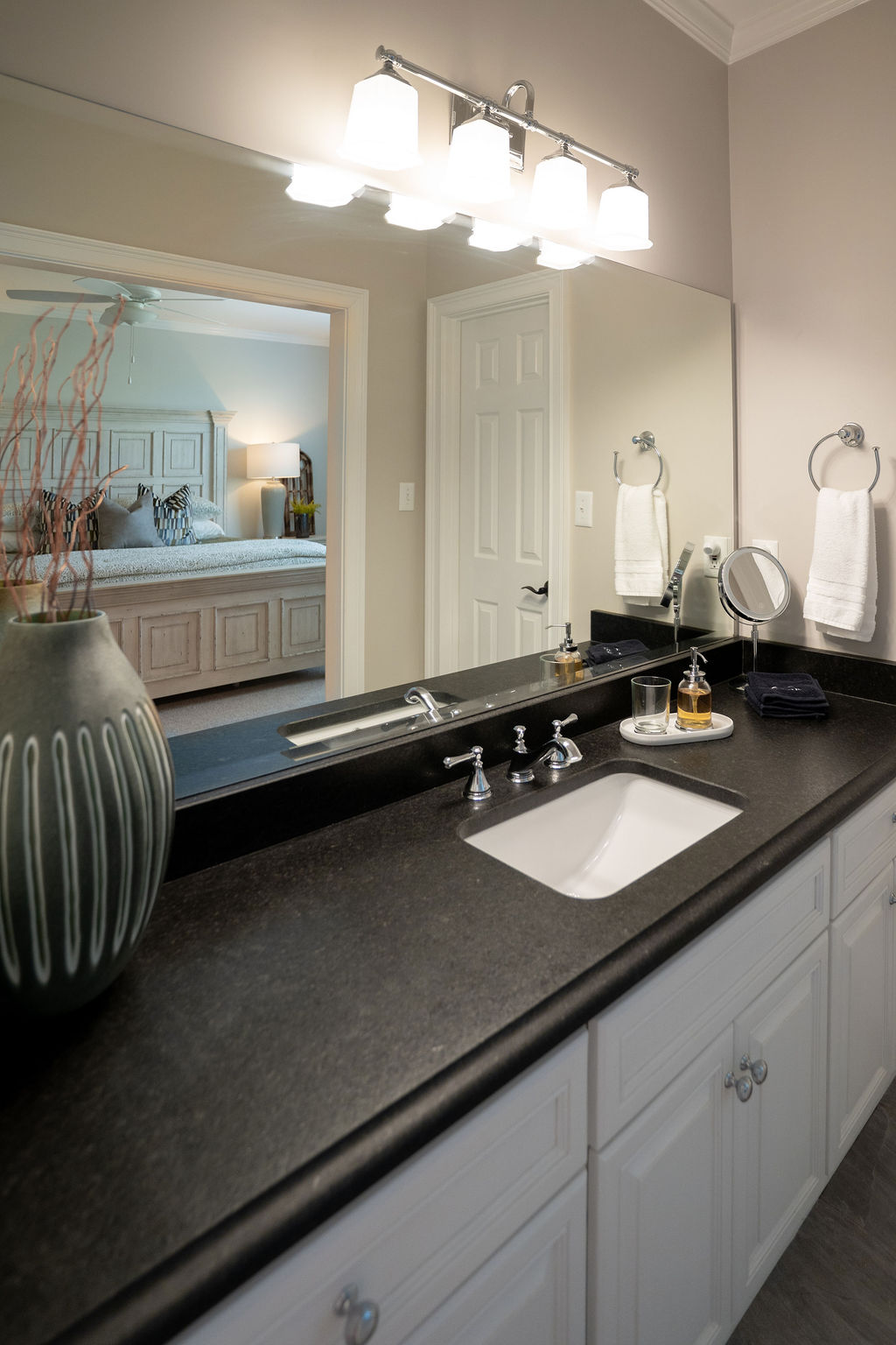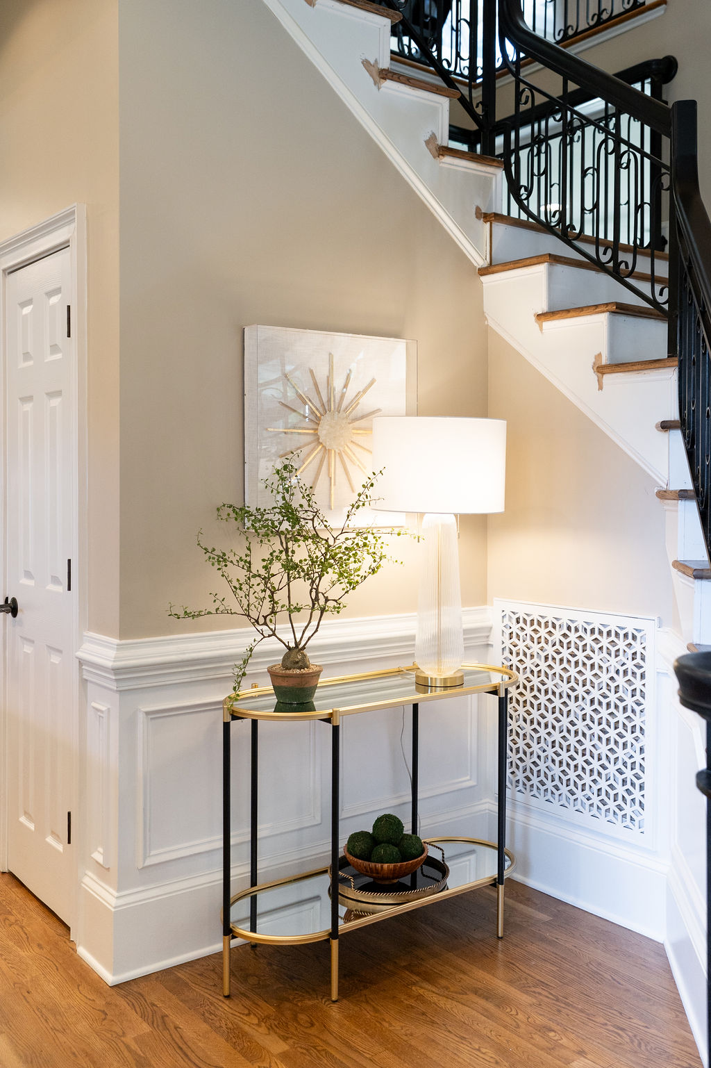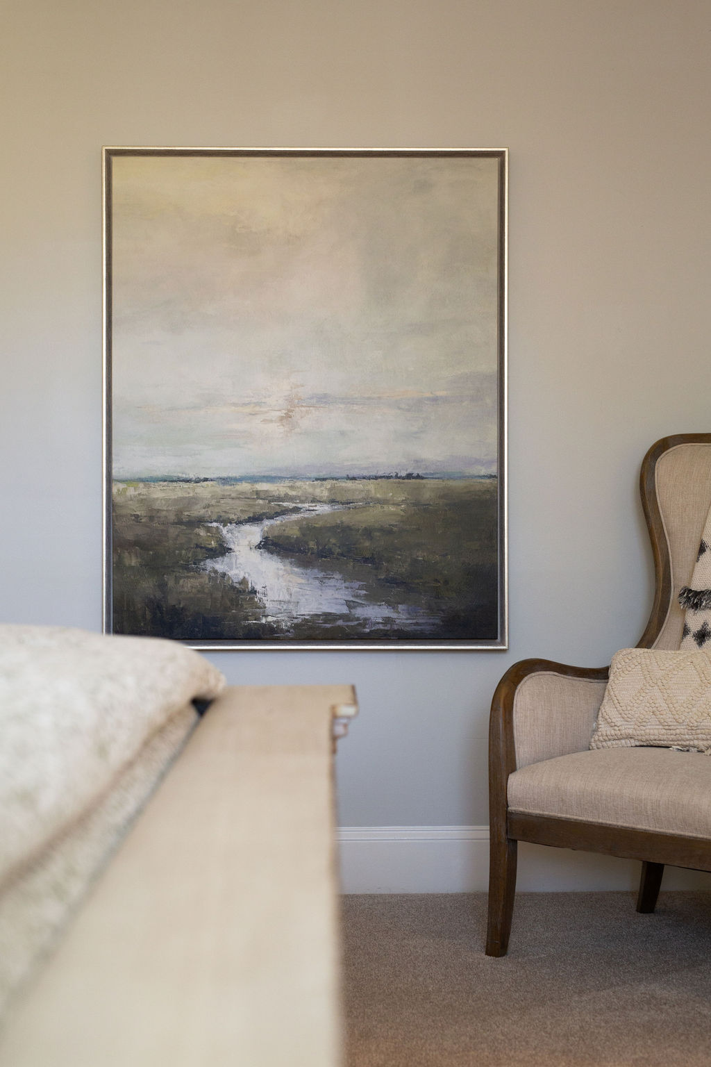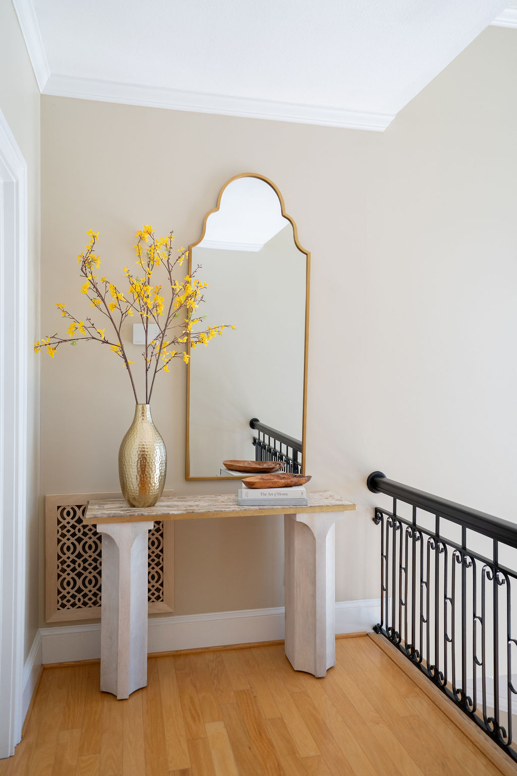 This graceful home pairs refined materials with a soft, livable palette to create spaces that feel both elevated and effortless. From the sculptural chandelier in the dining room to the tailored upholstery and layered rugs throughout, each room reflects a thoughtful balance of sophistication and comfort. Tones of ivory, blush, taupe, and pale gray flow from space to space, accented by textured fabrics, clean-lined furniture, and curated art. The result is a serene and welcoming retreat that’s elegant without being overdone – designed for real life, beautifully lived.